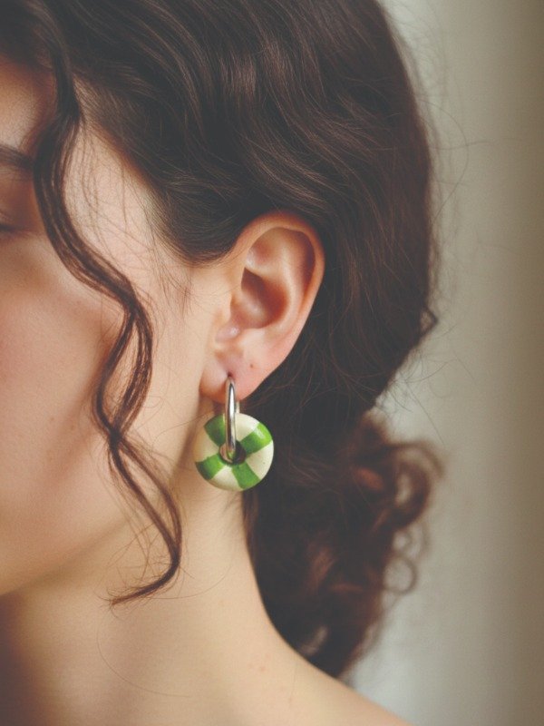 ¡Dale un giro divertido a tu look! Estos aros están inspirados en los clásicos flotadores retro, combinando un diseño circular de rayas en verde y crema que evoca días de sol y playa.