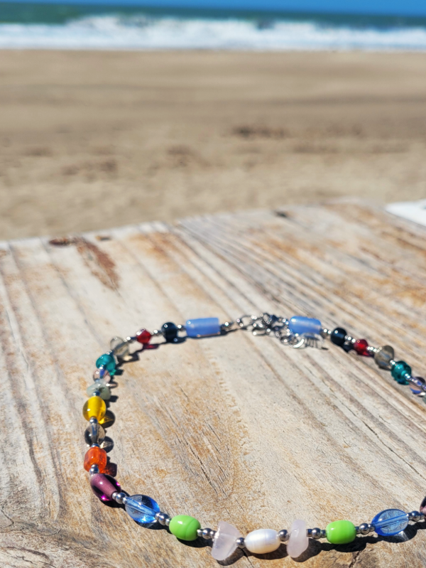 Collar de acero quirúrgico con cuentas de vidrio, cuarzo rosa y perla de río.